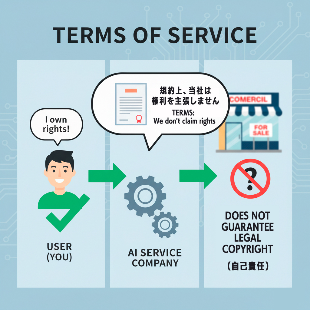 という、あくまでサービス会社と利用者の間での「契約(約束事)」に過ぎません。これは、AIサービス側が、あなたの生成した画像が「法律上の著作権を持つことを保証します」という意味では全くない点に、強く注意してください。