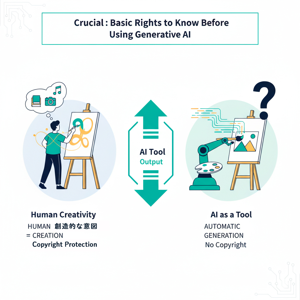 各サービスの細かいルールを見る前に、すべての生成AIに共通する「権利」の基本ルールを学びましょう。ここが一番重要であり、あなた自身を守るための「盾」となる知識です。